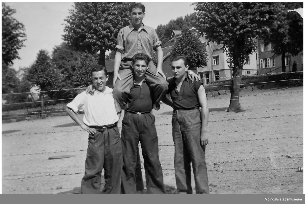 Tre unga män (flyktingar) står bredvid varandra framför Kvarnbyskolans instängslade grusplan. Abraham Frischer (född 1923 i Polen, död 2009 i Göteborg) ses längst till vänster. Mannen i mitten har en annan man sittandes på sina axlar. De ser glada ut. I bakgrunden ses byggnader i bostadsområdet Trädgården.
