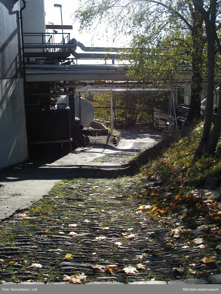Äldre stenbelagd väg intill byggnad vid Soabs industrianläggning i Mölndals Kvarnby, år 2007. Anläggningen användes vid fototillfället av Hexion Speciality Chemicals Sweden AB.