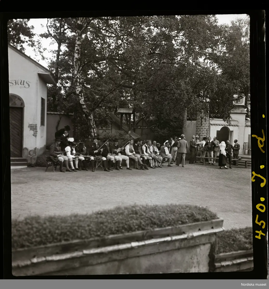 Folkmusiker sitter och vilar under en paus. Skansen, Stockholm. Skansen, Stockholm.