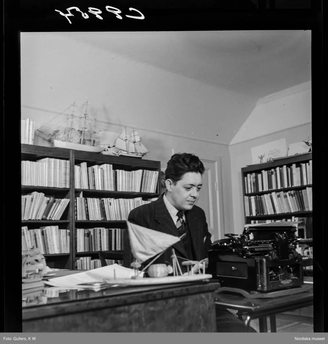509 Hammenhög v för Allers. En man sittandes vid skrivmaskin. PÅ bokhyllan bakom honom står modellfartyg.