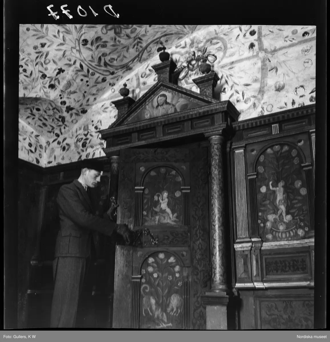 511 Gripsholms Slott för Allers. En man vid en dörr i ett rikt dekormålat rum - Hertig Karls kammare.