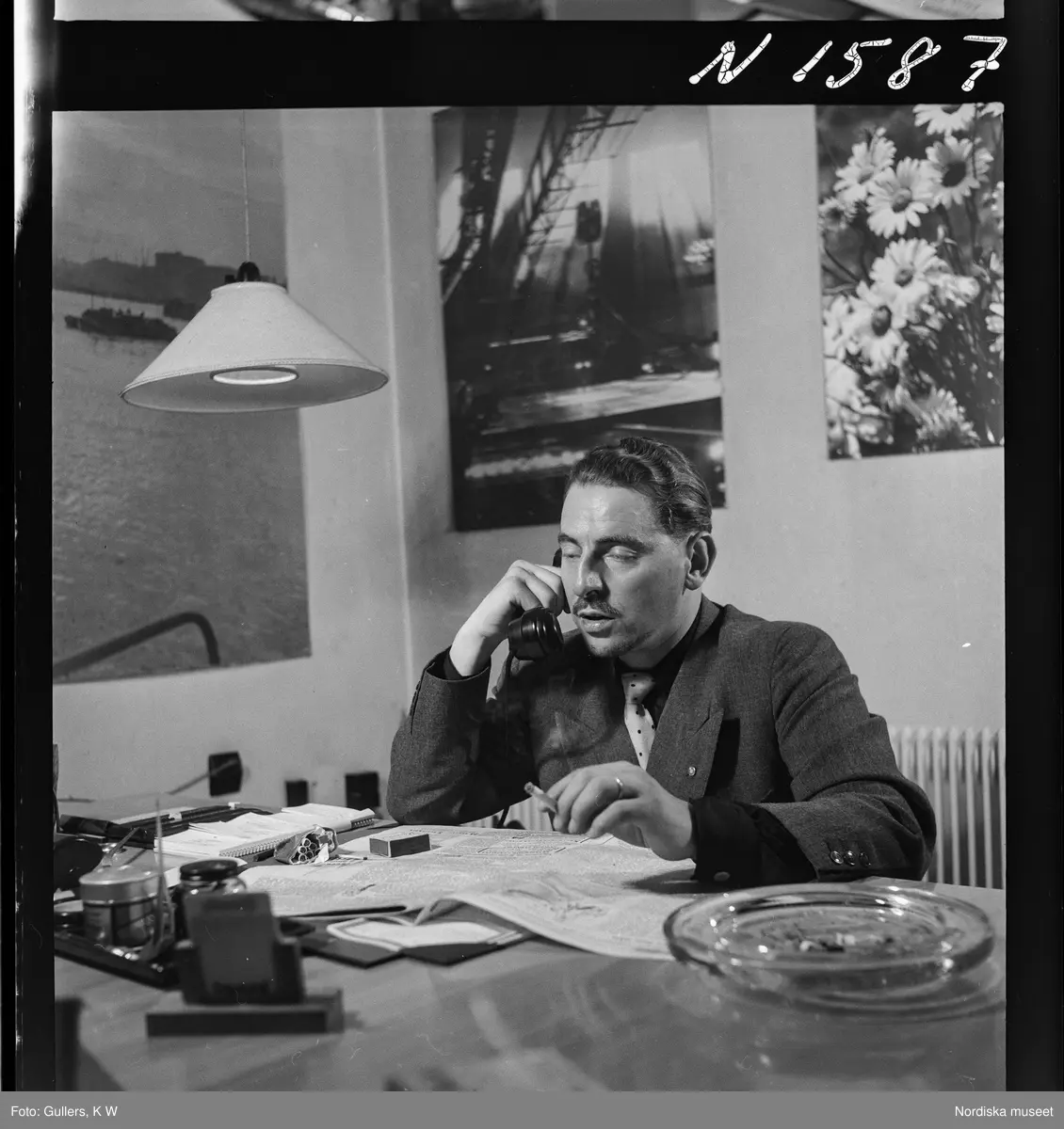 513 E Redaktör Runar Karlströmer, på studion. Runar Karlströmer pratar i telefon vid sitt skrivbord.