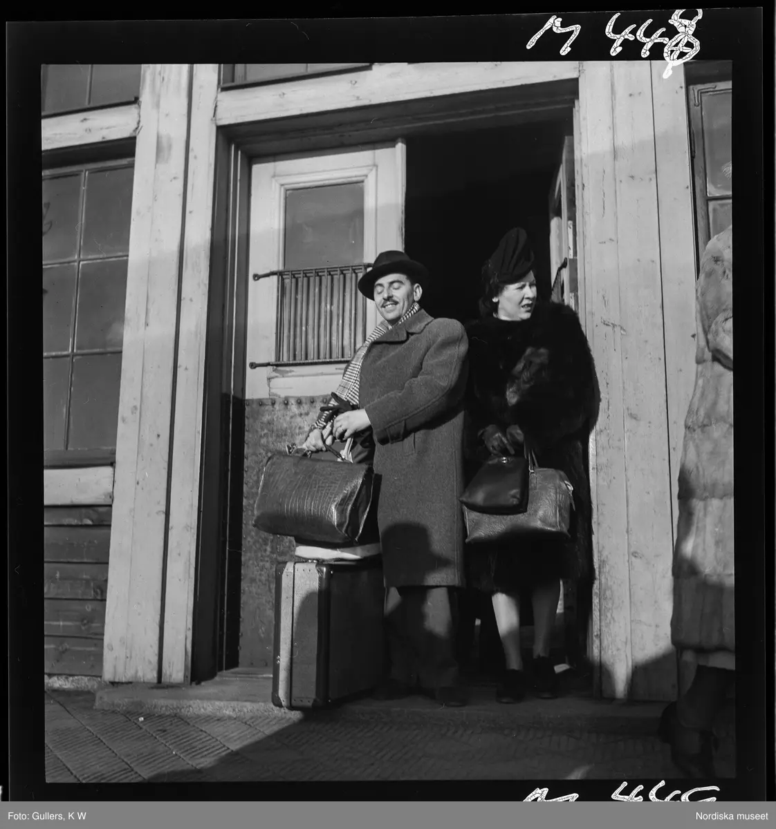 513 E Redaktör Runar Karlströmer hem från Danmark. En man och en kvinna står utanför ett hus med sitt bagage av hand- och resväskor.