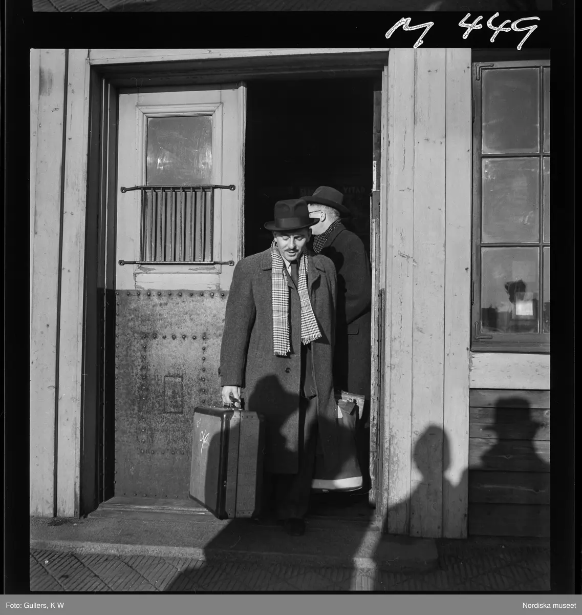513 E Redaktör Runar Karlströmer hem från Danmark. Runar Karlströmer, med resväska i handen, påväg ut ur en byggnad.