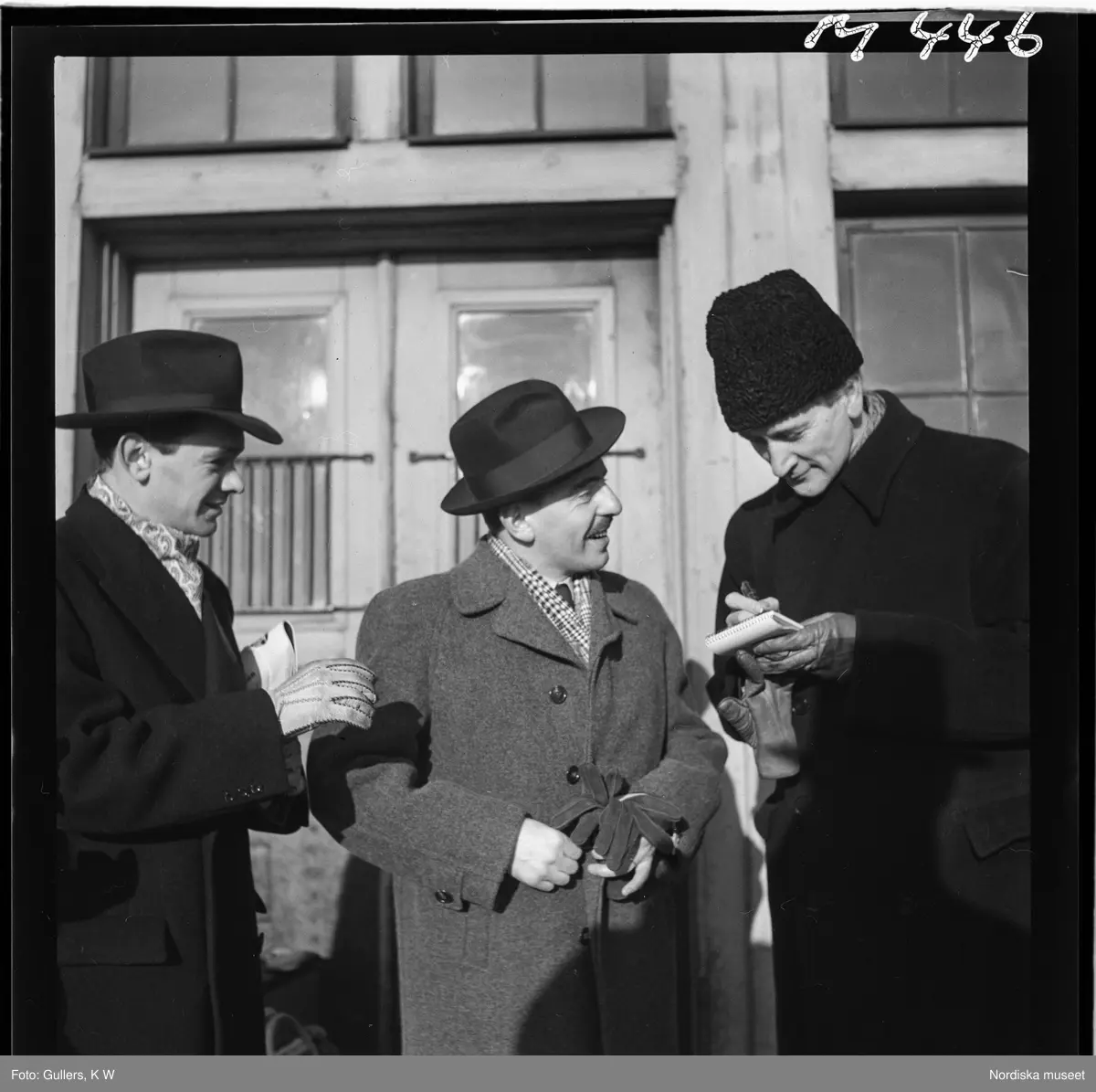513 E Redaktör Runar Karlströmer hem från Danmark. Tre män i hatt och rockar. Runar Karlströmer i mitten. En man skriver i ett litet anteckningsblock.
