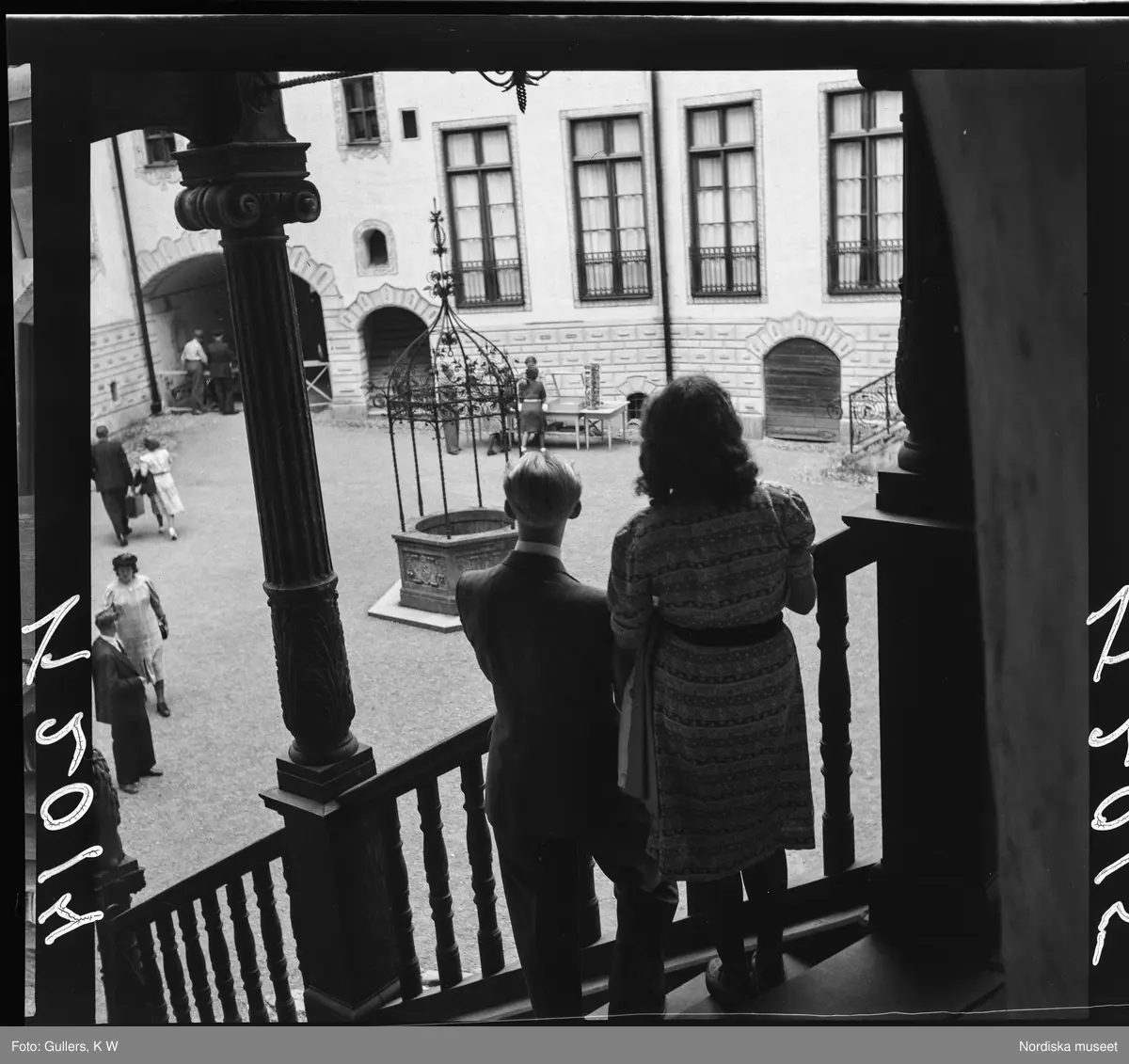 511 B Gripsholms Slott. Ett par står i en trappa och blickar ut över borggården.
