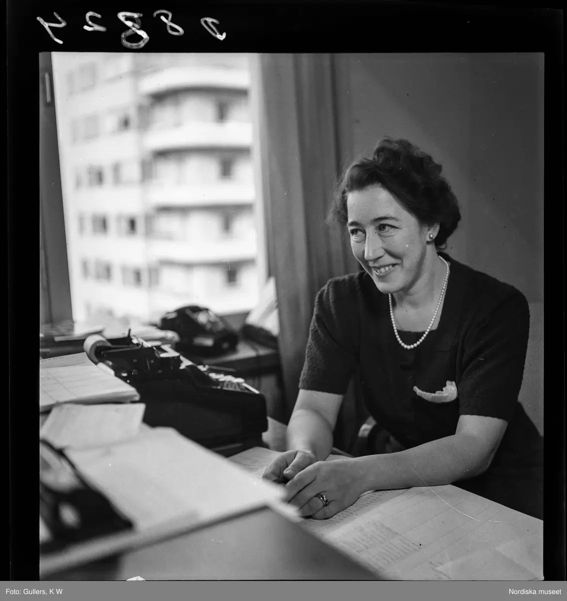534 Polisskolan. En kvinna sittandes vid ett skrivbord fullt av papper och en räknemaskin.