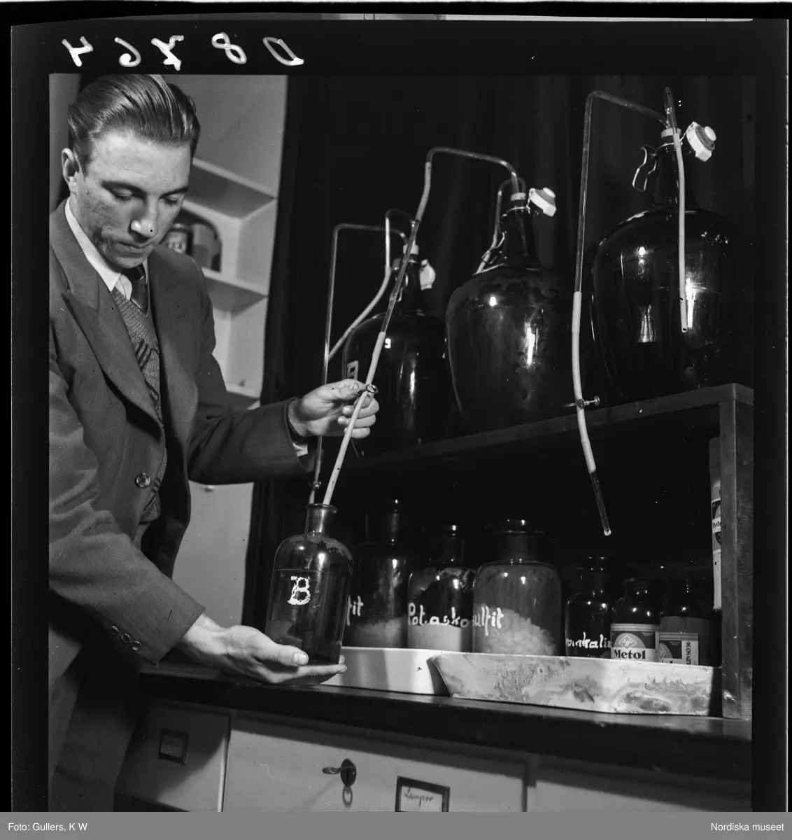 534 Polisskolan. En elev hanterar flaskor i kemi-laboratorium.