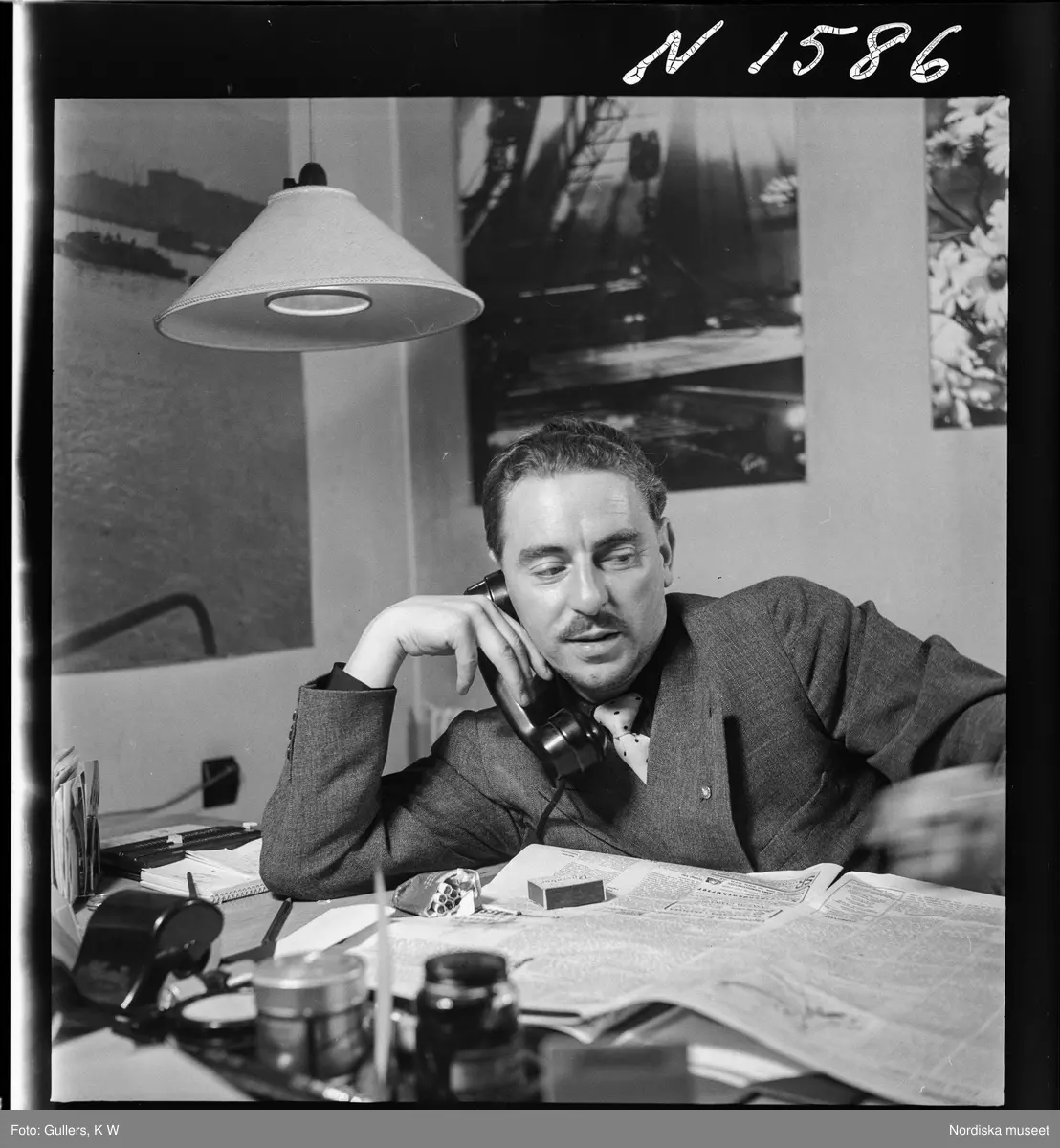 513 E Redaktör Runar Karlströmer, på studion. Runar Karlströmer pratar i telefon vid sitt skrivbord.
