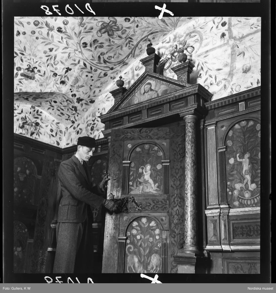 511 Gripsholms Slott för Allers. En man öppnar en dekorerad målad dörr. Även väggar och tak har målade mönster i Hertig Karls kammare.