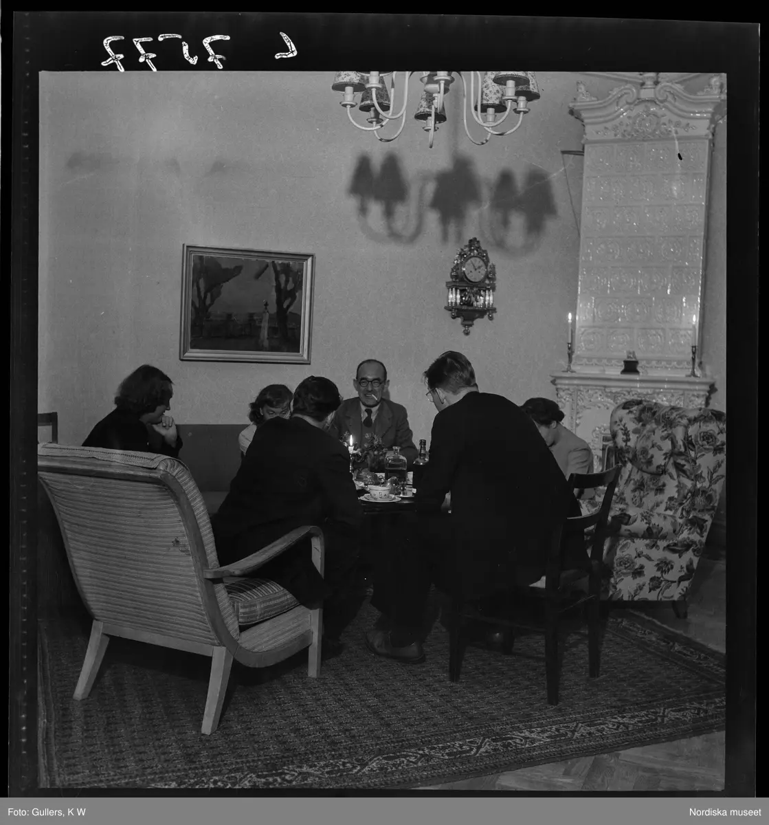 513 D Spooners Hemma hos redaktör Karlströmer. Ett sällskap samlat i en soffgrupp. Kaffekoppar och flaskor på bordet.