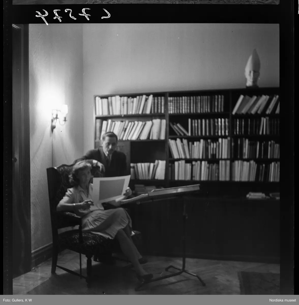 513 D Spooners Hemma hos redaktör Karlströmer. Man och kvinna tittar på en bild sittandes framför en bokhylla i ett vardagsrum.