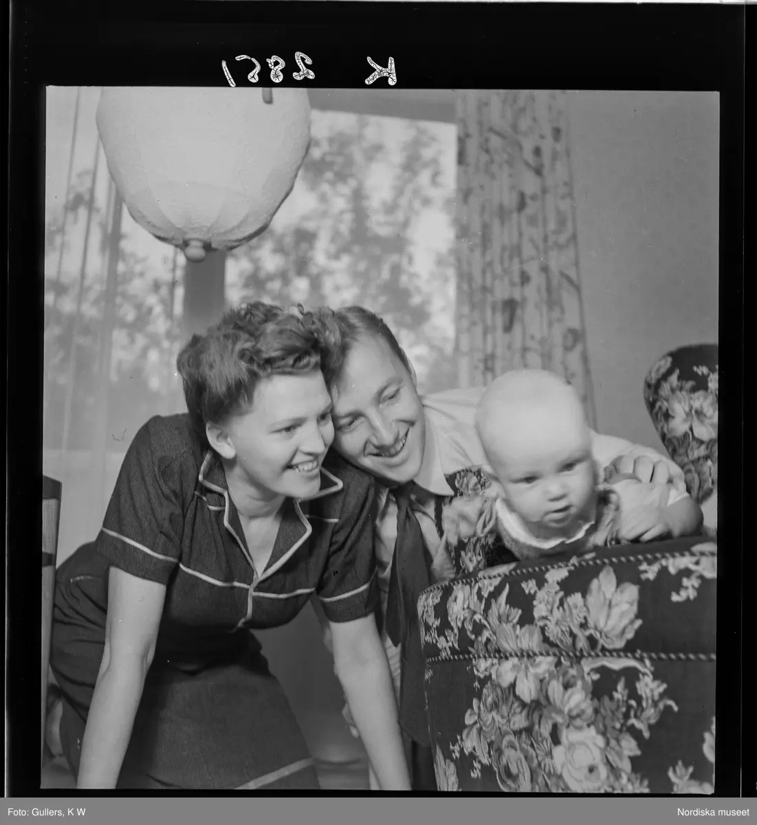 513 B Red. Karlströmer. Familj. Föräldrar tittar på ett litet barn i en blommig fåtölj.