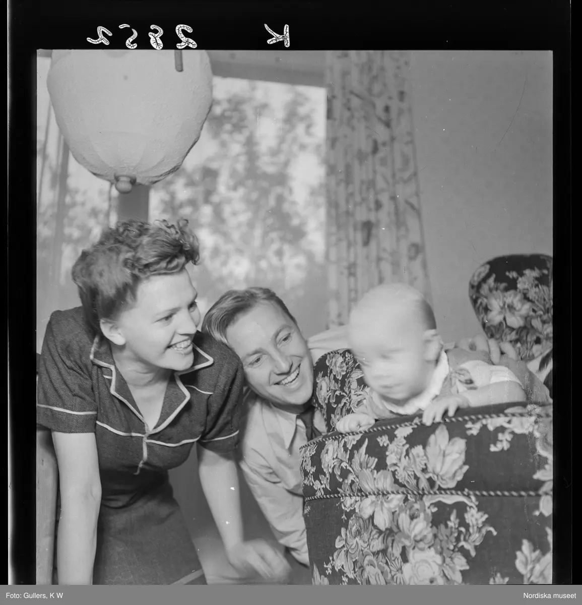 513 B Red. Karlströmer. Familj. Leende föräldrar tittar på ett litet barn i en blommig fåtölj.