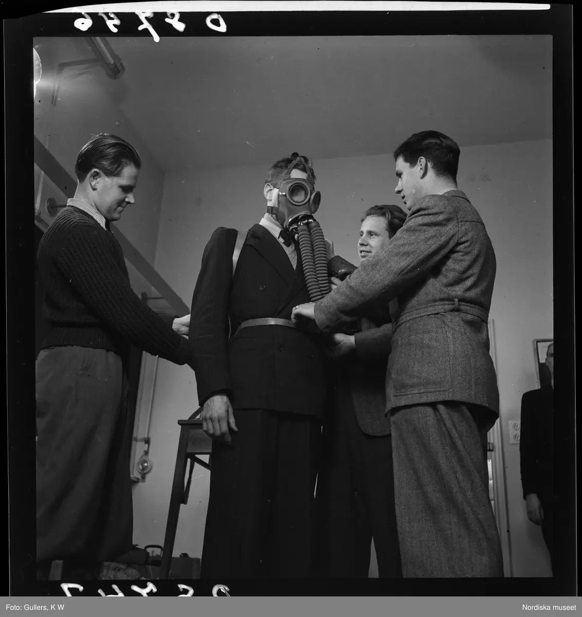 534 Polisskolan. En ung man får hjälp av tre andra att prova en gasmask (?).