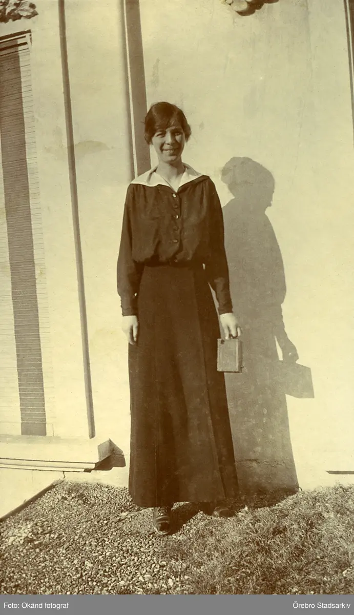 Ung kvinna med kamera står framför vägg i Frankrike, 1919