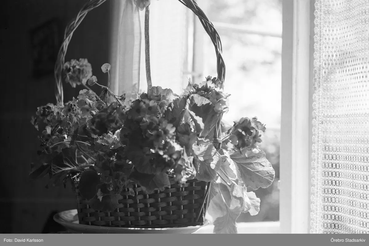 Flätad korg med blommor i köksönstret på Karlstorp, 1940-tal