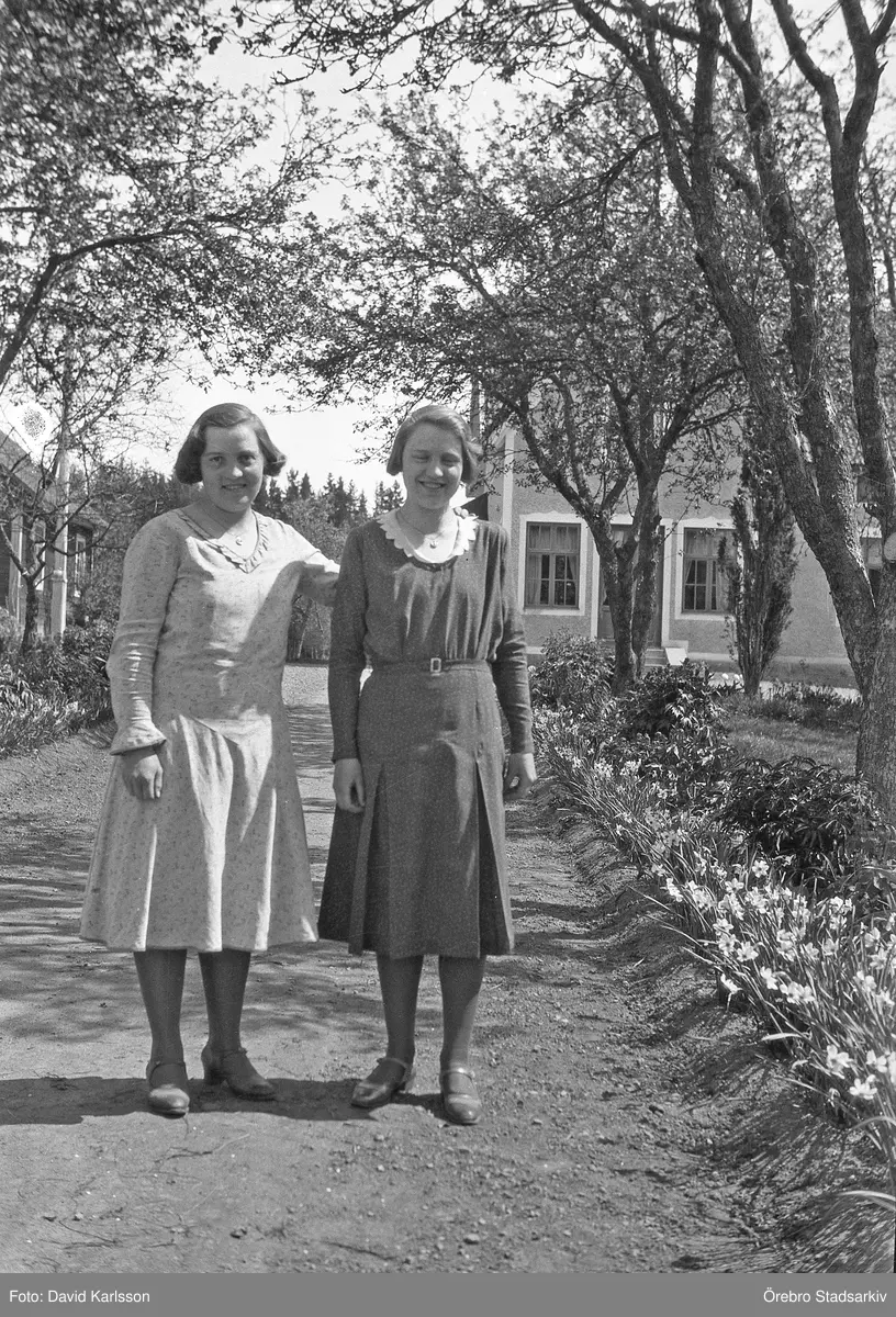 Elna och väninna i trädgården vid Lysinge, 1940-tal