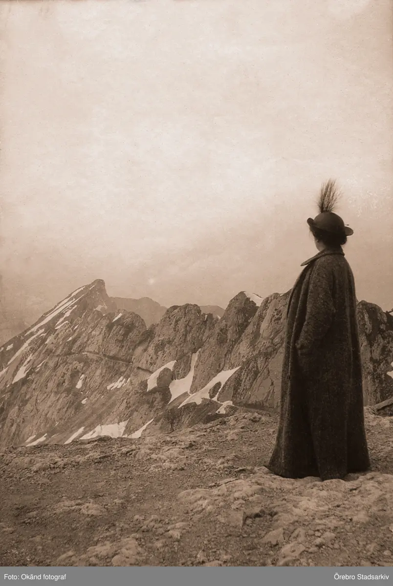 Äldre kvinna blickar ut över berg i Frankrike, 1919