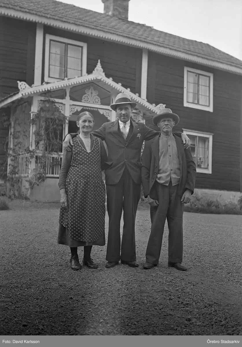 Linus, Maria och Viktor Karlsson framför huset i Karlstorp, 1930-tal