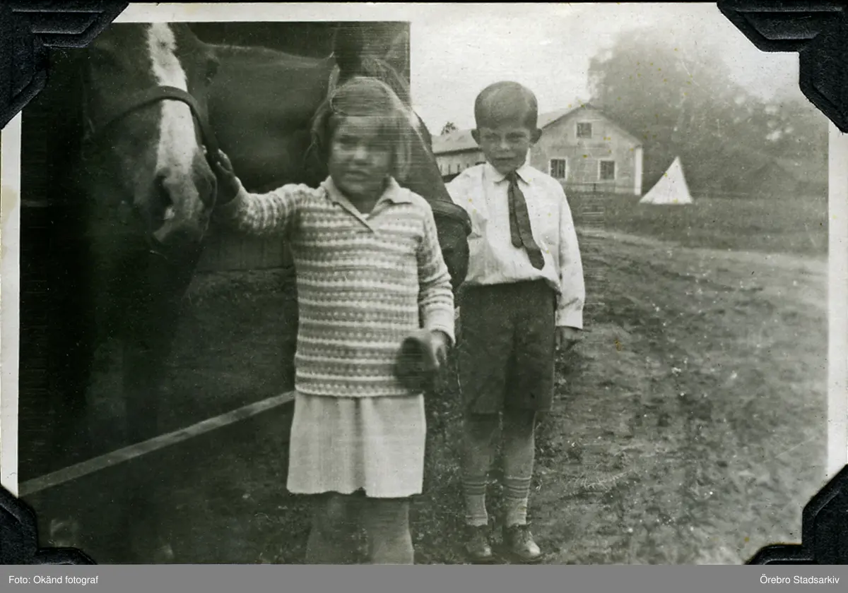 Syskonen Gripenstedt hos gårdens hästar, ca1930