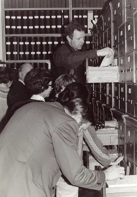 Hembygdsförbundets studiebesök på Nordiska museets folkminnesamling 1980-11-27.
