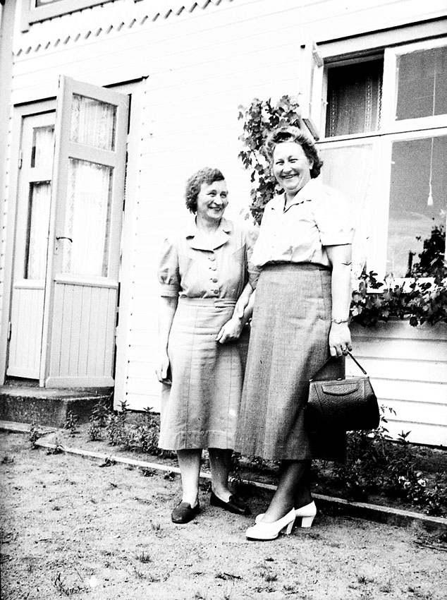Titel: Två kvinnor utanför ett hus.