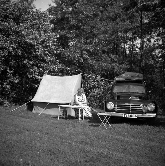 En kvinna sitter utanför tältet, bredvid en Volvo PV.