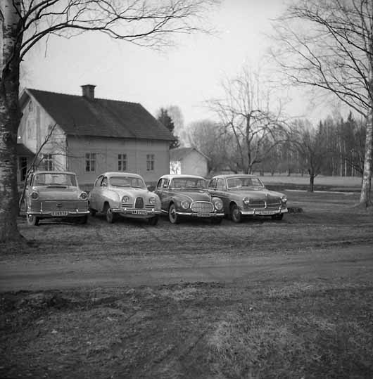 Fyra uppställda bilar, från vänster: Opel rekord, SAAB 93, DKV och Volvo Amazon.