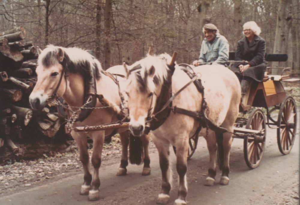 Färgfotografi föreställande Greta Nilsson och hennes bror Nils Nilsson. De sitter i en hästvagn som dras av två gulvita fjordhästar.