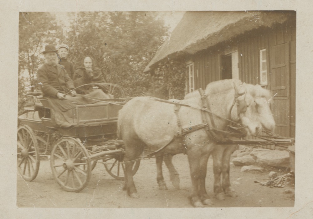 Svartvitt fotografi föreställande Nils Kristiansson 1846-1925 och hans hustru Ingrid Troedsdotter 1843-1919 sittande i en hästvagn dragen av två hästar.Nils har hatt och rock och Ingrid är klädd i sjal och huckle, över knäna på dem båda ligger en pläd. Mellan makarna står en liten pojke. Hästekipaget står parkerat framför torpet där i Pålsjö där familjen bodde.