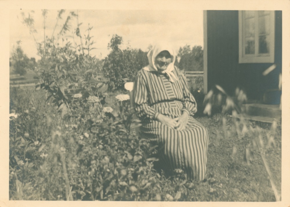 Svartvitt fotografi föreställande Ingrid Troedsdotter 1843-1919 sittande på en stol i trädgården. Ingrid har randig klänning och vitt huckle.