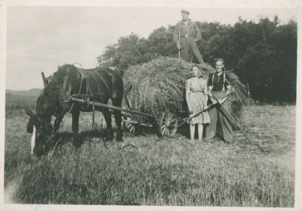 Svartvitt fotografi föreställande två män och en kvinna som står framför en hästvagn fullastad med hö.
