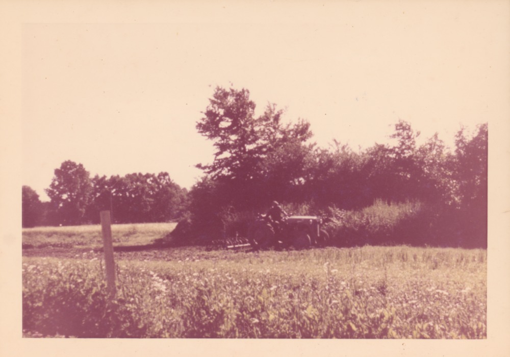 Färgfotografi föreställande Nils Nilsson sittande i en traktor. Han är i färd med att harva en åker.