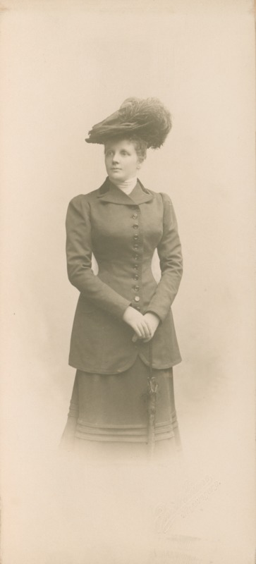 Svartvitt fotografi föreställande Sara Hellerström vid 32 års ålder. Inom rektangular ornamenterad metallram och glas.