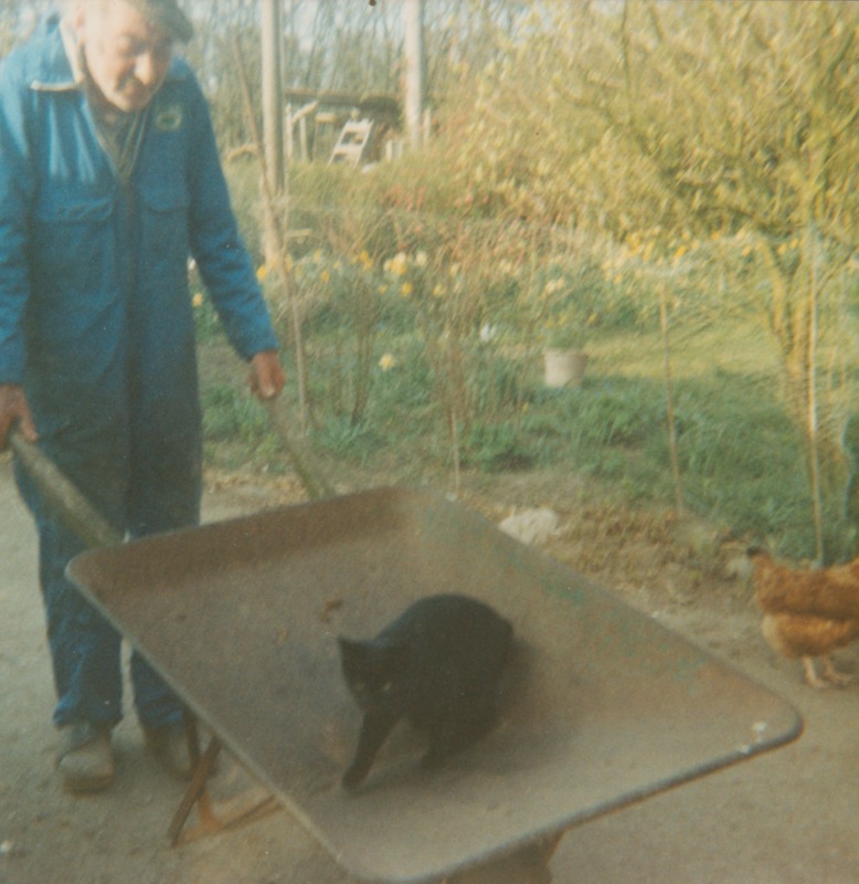 Färgfotografi föreställande Nils Nilsson. Han håller i en skottkärra och i den sitter en svart katt. Nils är klädd i blå arbetsoverall och bilden är tagen vid torpet på Pålsjö.