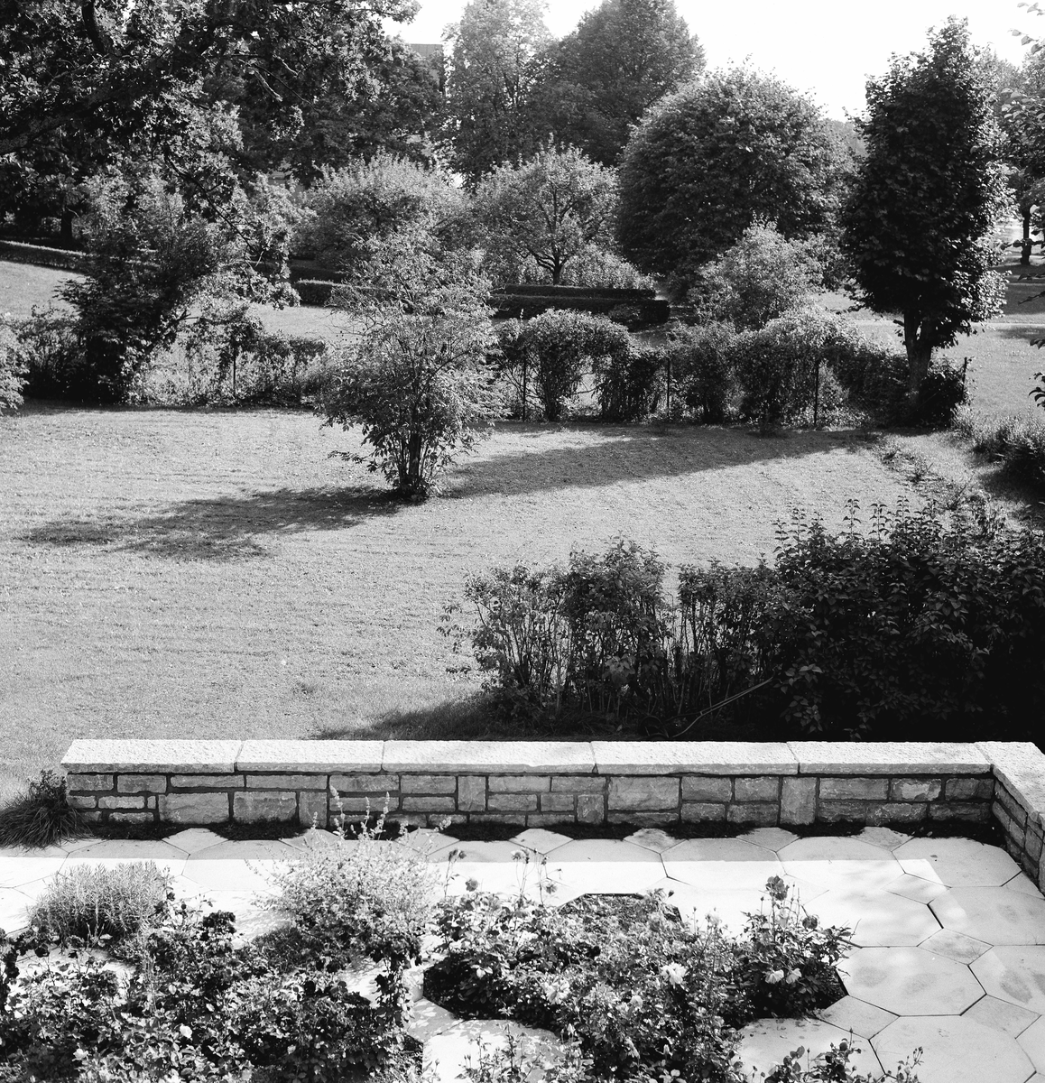 Exteriör, sittplats belagd med betongplattor i trädgård