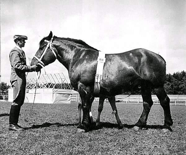 Husdjursavel. Bilder från lantbruksmötet, 1945 på Påskbergsvallen i Varberg. Sto med föl. Tillhör samlingen med fotokopior från Hallands Nyheter som är från 1930-1940-talen.