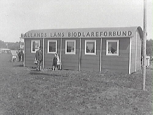 Tidningsartikel: "40,000 personer besökte lantbruksmötet i Varberg". Publicerad i Hallandsposten, 1945-06-11. Hallands Läns Biodlareförbunds stuga på Lantbruksmötet som hölls på Påskbergsvallen.