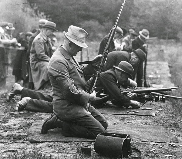 Skytte. Troligen från Varbergs skjutbana som låg sydöst om Nya Påskbergets friluftsområde. Män sitter och ligger med gevär. Uppgifter saknas. Tillhör samlingen med fotokopior från Hallands Nyheter som är från 1930-1940-talen.