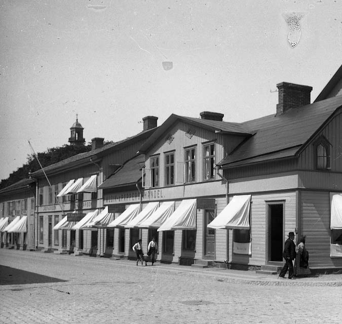 Hörnet av Torggatan och Östra långgatan i Varberg. I bottenvåningen av hörnfastigheten ligger en musik- och pappershandel med bostad på ovanvåningen. Här inrättade fotograf Gustaf Björkström sin fotoateljé och bostad 1906. Ett takfönster togs då upp i det bortre takfallet. Se även bildnr GB2_6738.