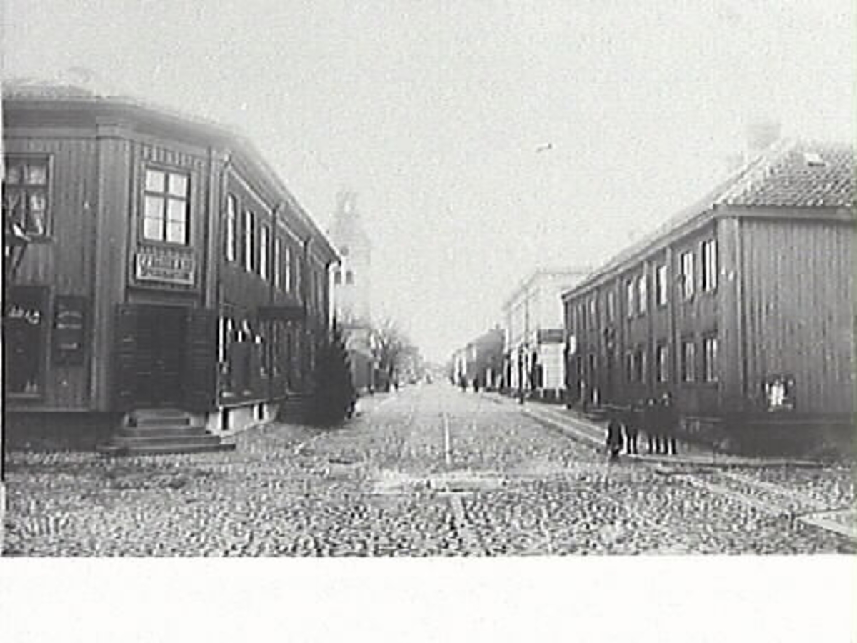 Kungsgatan åt söder, närmast Norrgatan, t v kv Kommerserådet, t h kv Professorn. T v affärsskylt: C F Bagge & Co Speceriaffär. T h på andra sidan gatan fr v: Alma Andersson Modeaffär, Maria Ranch (And (Anders) Bäckström) Garn & manufaktur, Tapisseri. På huset t h eventuellt en teateraffisch. Foto från slutet av 1800-talet till början av 1900-talet.