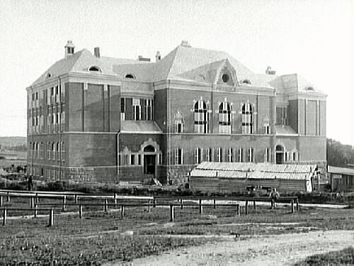 Södra folkskolan i Varberg, senare Rosenfredsskolan, troligen relativt nybyggd eftersom ett par skjul står framför skolan. Bilden är tagen från nordost. Skolan byggdes av byggmästare Johannes Nilsson enligt Lars Kellmans ritningar och invigdes i november 1910. Där fanns från början 23 lärosalar med speciella utrymmen för bl a fysik, kemi, teckning och slöjd, en stor aula och gymnastiksal. Åt skolvaktmästaren fanns en bostad. Byggnaden var försedd med både centralvärme och elektriskt ljus.