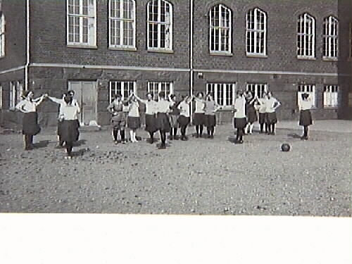 Gymnastik på Rosenfredsskolans/Södra folkskolans gård. Eleverna ser ut att göra någon danslek och på gården ligger en boll. Troligen 1920-talet.