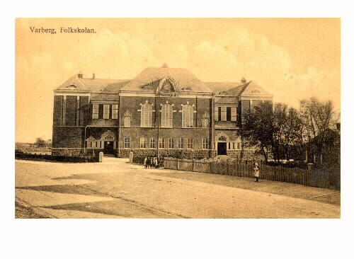 Vykort, "Varberg, Folkskolan", senare Rosenfredsskolan (Södra folkskolan), kv Folkskolan 1. Skolan stod klar 1910. Fasad mot norr. Vid staketet står några små barn.