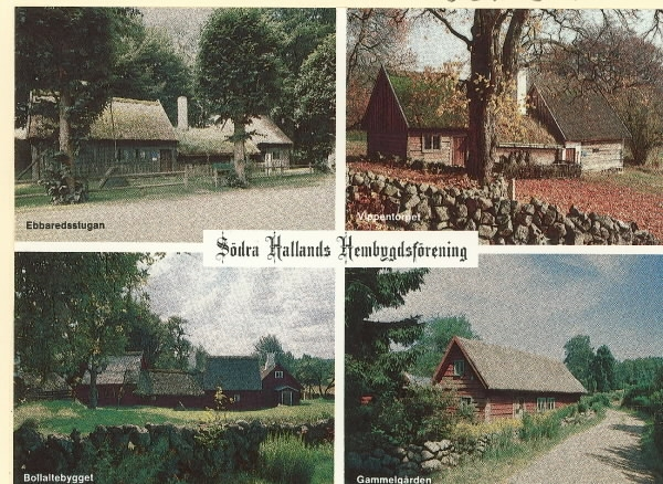 Ryggåsstuga. Flermotivsvykort av Ebbaredsstugan, Vippentorpet, Bollaltebygget och Gammelgården. Alla utom Gammelgården visar högloftsstugor.