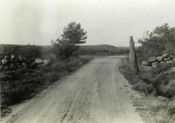 Gammal väg genom hedlandskap, vägen mellan Frillesås-Gällinge, nära Breared i Gällinge. Till höger förefaller en rest sten stå i vägkanten vid stengärdsgården.