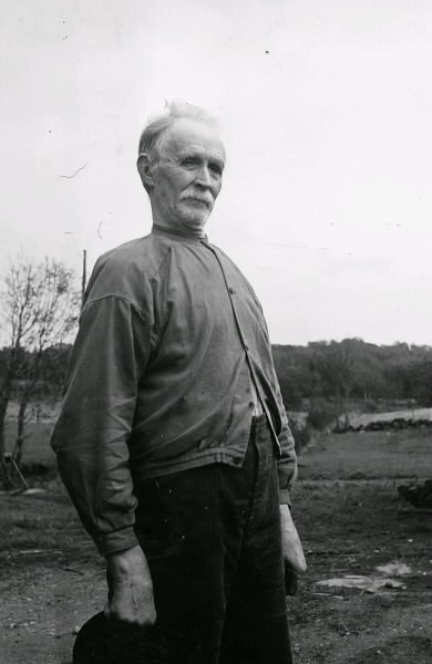 Tre fotografier tagna utomhus av lantbrukaren J B Bengtsson på Karshult gård i Gällinge. Född 1858-10-24, död 1950-06. Han står vid en husknut med odlingslandskapet i bakgrunden.