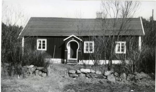 Stuga väster om Åsa med nyckelhålsformad så kallad skunke, dvs liten tresidig förstukvist med sittbänkar längs sidorna. Över öppningen sitter en lyckobringande hästsko.