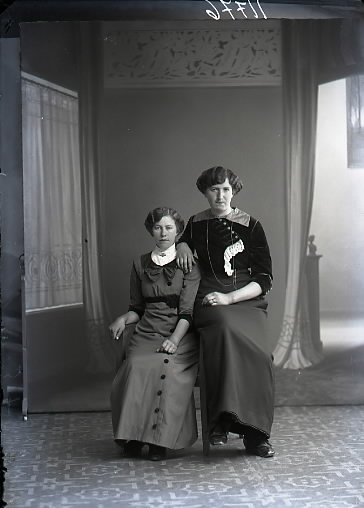 Ateljéfoto av två sittande kvinnor i helfigur. Beställare och sannolikt en av kvinnorna var Emma Johansson, Gällinge nr 2.